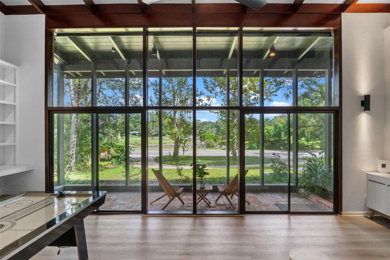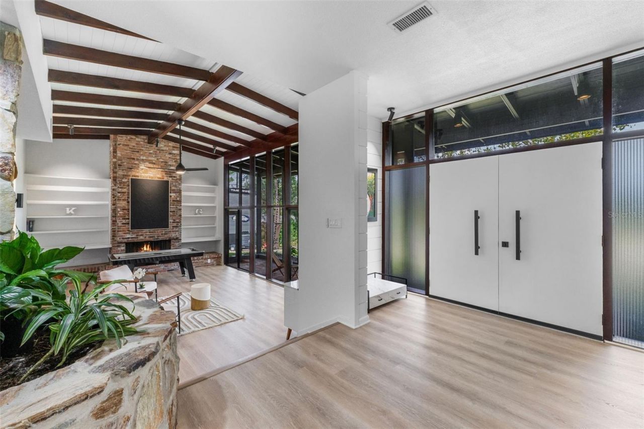 Fully remodeled mid-century modern home on a rare 0.64-acre corner homesite in Longwood's desirable Sanlando Springs area with panoramic views of the pond and park across the street.Situated across four original platted lots, this single-story concrete block residence offers 3 bedrooms, 2.5 baths, and 2,337 square feet of thoughtfully updated living space.The living room features a dramatic 20' x 12' wall of windows overlooking the pond, fountain, and park, along with a striking floor-to-ceiling...Fully remodeled mid-century modern home on a rare 0.64-acre corner homesite in Longwood's desirable Sanlando Springs area with panoramic views of the pond and park across the street.Situated across four original platted lots, this single-story concrete block residence offers 3 bedrooms, 2.5 baths, and 2,337 square feet of thoughtfully updated living space.The living room features a dramatic 20' x 12' wall of windows overlooking the pond, fountain, and park, along with a striking floor-to-ceiling brick wood-burning fireplace that anchors the space. The designer kitchen is centered around a quartz waterfall island with seating and overlooks the patio and private garden. Clean modern lines define the space with concealed outlets, integrated controls, and a concealed dishwasher, while custom cabinetry includes full pull-out drawers for exceptional functionality and storage.The primary suite features a spacious walk-in shower with rain fixtures. Bedrooms two and three share a Jack-and-Jill bathroom with a freestanding soaking tub. Two bedrooms include walk-in closets and French doors that open directly to the backyard.Additional features include a skylit laundry area with built-in cabinetry, abundant storage throughout the home, and additional storage closets within the carport.The fully fenced property offers expansive outdoor space including a vegetable garden and storage shed. A circular driveway in the front and a secondary private driveway behind the home provide flexible parking options.No HOA. RV parking permitted with dedicated RV hookups. Additional upgrades include a whole-home water softener system and reverse osmosis filtration system.Located across from the former Rolling Hills Country Club property and conveniently close to parks, shopping, dining, and major roadways, with quick access to Interstate 4.